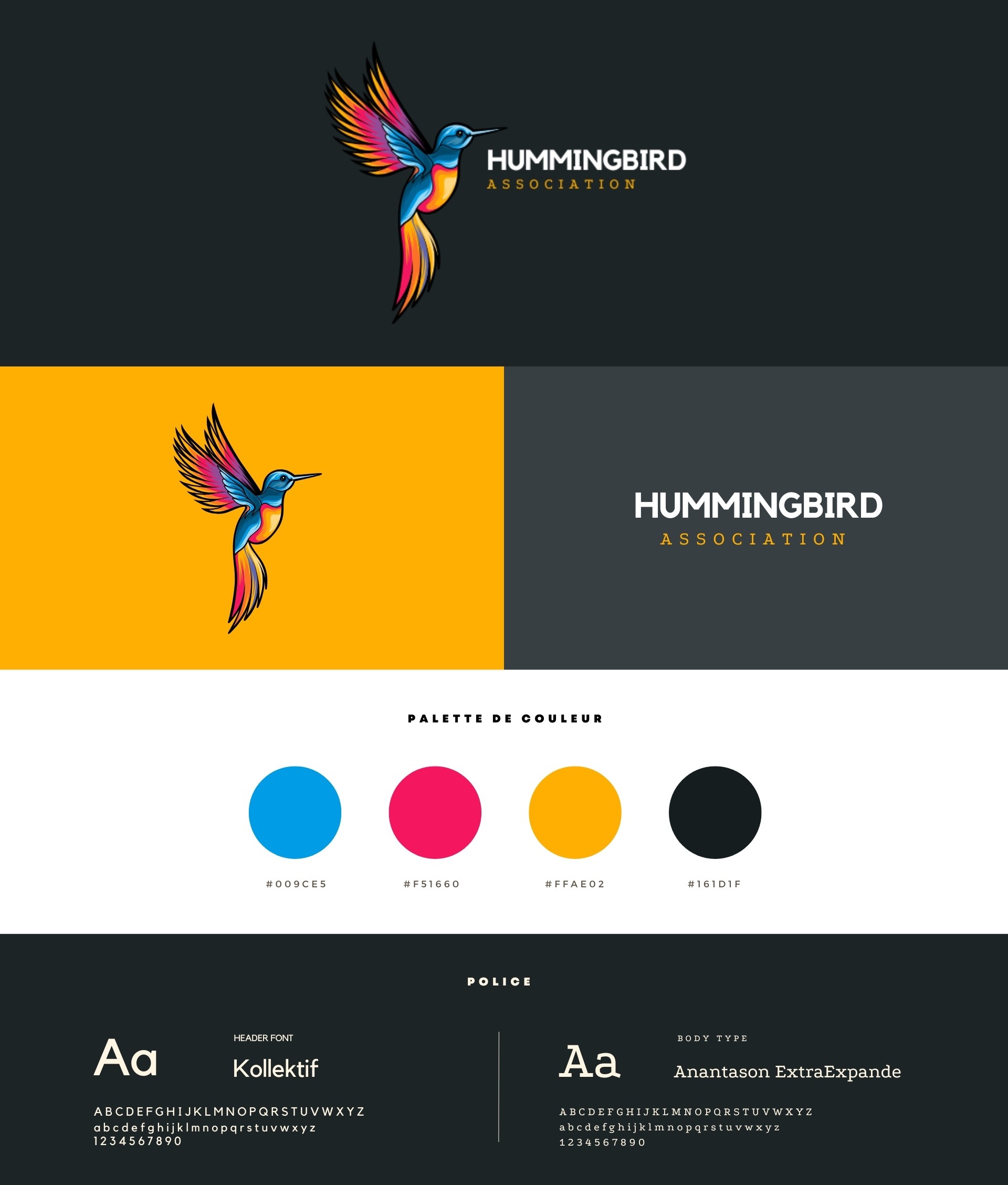 Les couleurs choisies sont un mélange de tons naturels et vibrants, symbolisant la nature, l'énergie et l'espoir. Chaque détail a été pensé pour rendre hommage à l'engagement écologique et humain d’Hummingbird, tout en offrant une identité visuelle forte, moderne et intemporelle.