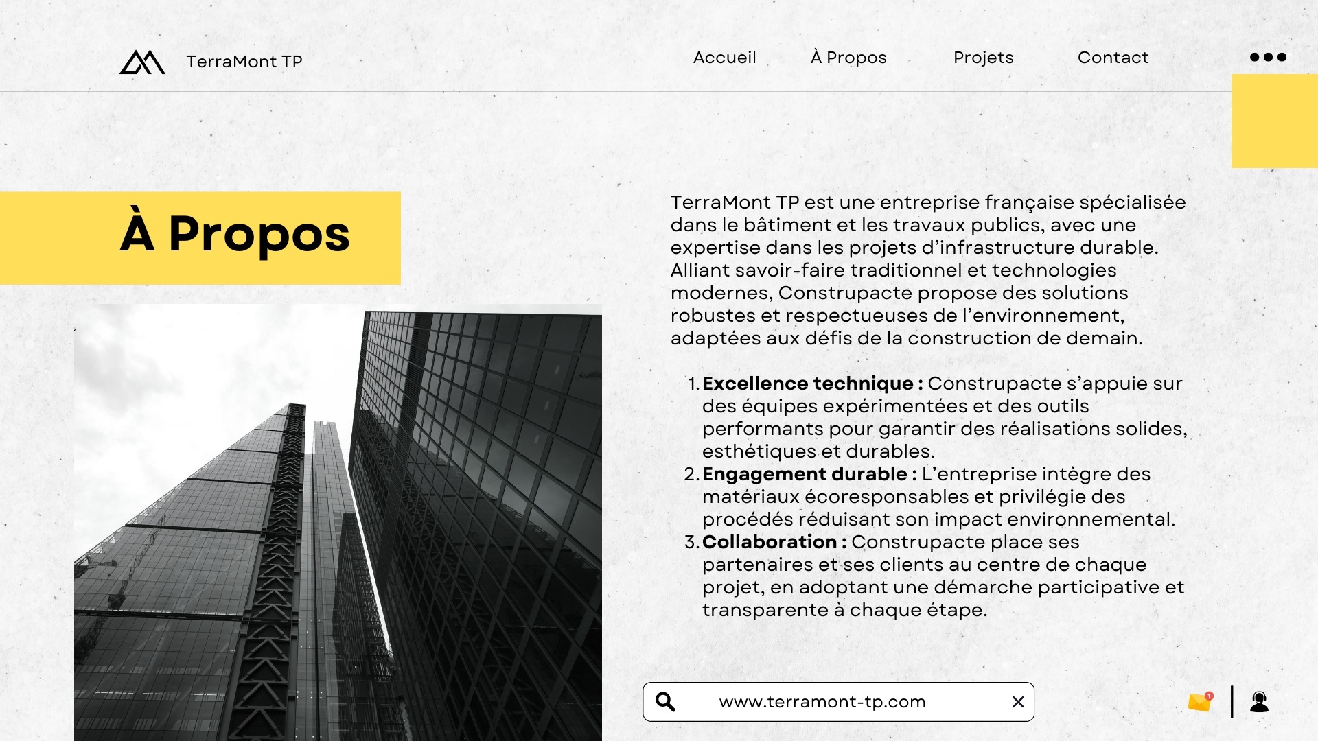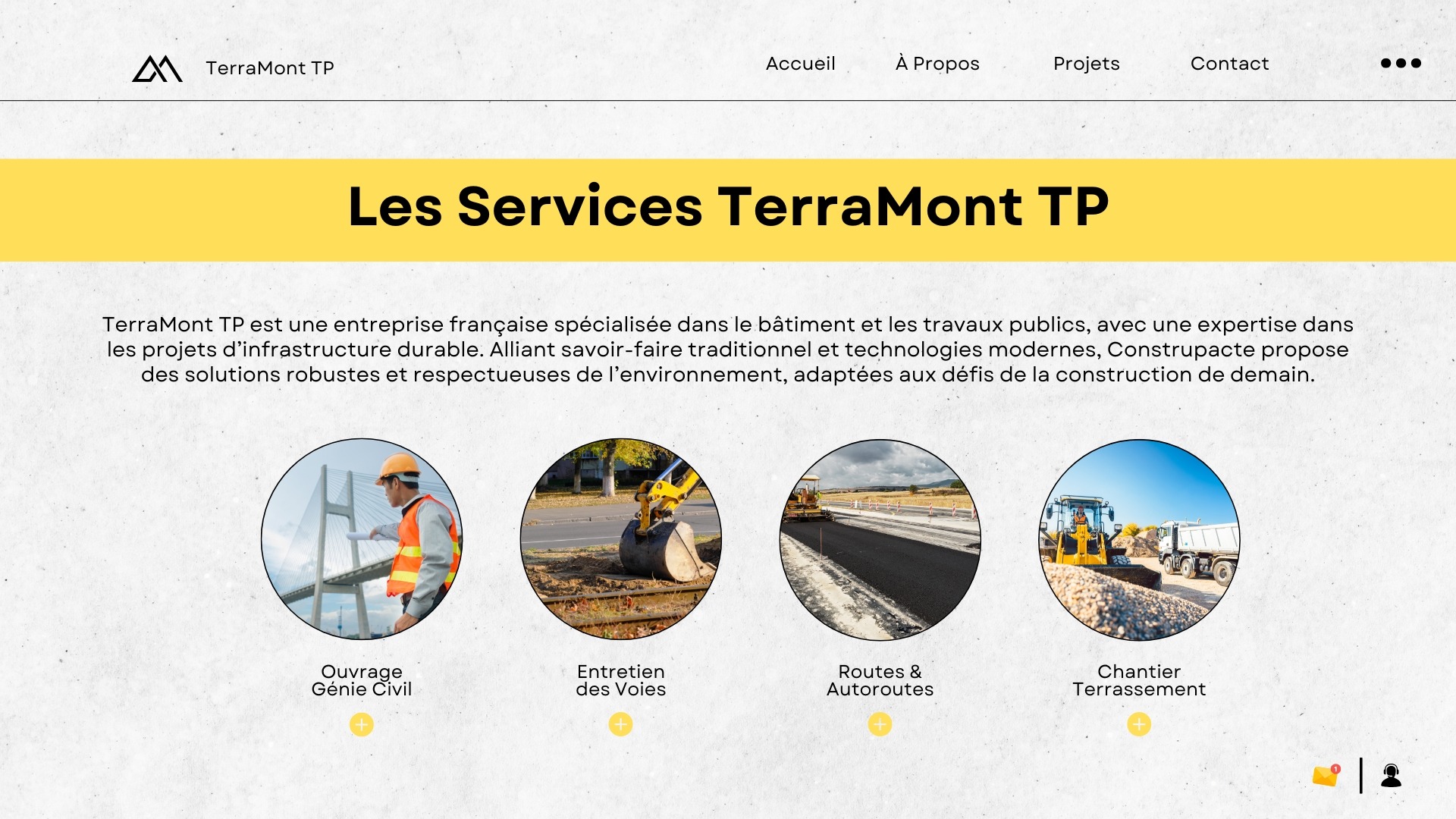 Pour refléter le positionnement de Terramont TP en tant que leader dans les infrastructures écoresponsables, nous avons conçu une page dédiée aux dernières innovations de l’entreprise. Elle présente les technologies utilisées, comme les matériaux recyclés et les techniques de construction à faible empreinte carbone, avec des contenus interactifs tels que des animations et des vidéos explicatives.